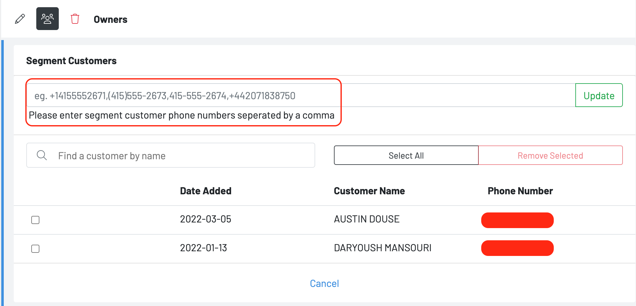 Upload a list of customers’ phones numbers