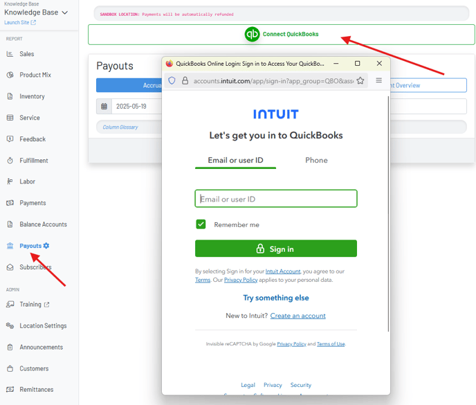 - Click on your Payouts page and click connect QuickBooks at the top. From here, you will be prompted for your QuickBooks credentials.