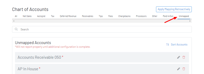 A red asterisk and an account still in unmapped denotes a QBO GL Code but no corresponding GoTab accounting group has been set.