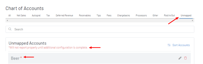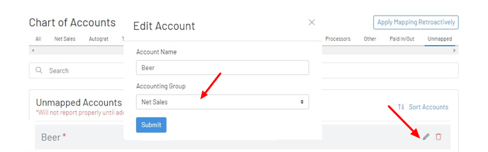 *Example: The pencil icon on the unmapped Beer account here then allows us to set the GoTab “Net Sales” accounting group for this Beer GL imported from QBO. *
