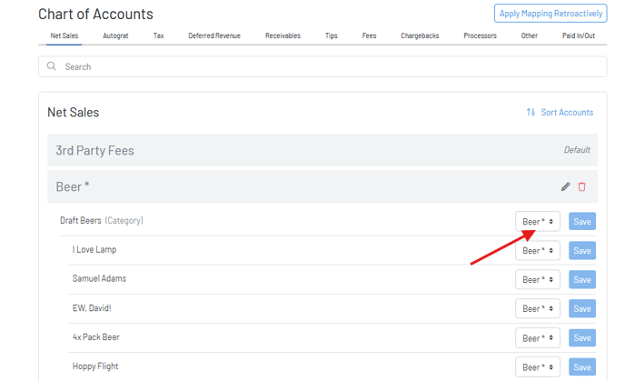 In the image below we show where we can set our newly mapped Draft Beers category to Beer* (the asterisk is how you know this is an account mapped to QBO). Because we chose to set it on the Draft Beers Category in the example below, it will automatically apply to all products in that category. If you instead had products within this category that you wanted to map to something other than beer, you would instead go item by item and choose the net sales account you want.