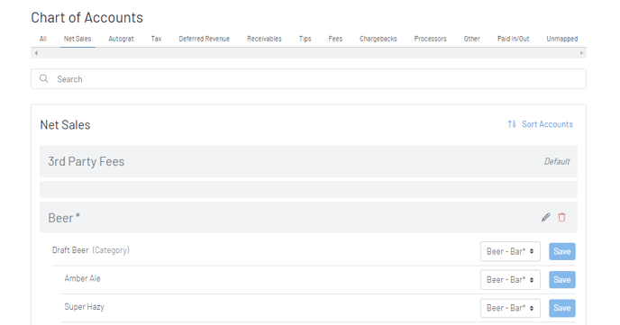 An asterisk by the account name indicates that this is an imported QBO GL Code and that a GoTab accounting group has been associated. The account then will also no longer show in unmapped. In our Beer example, you now see it is showing under Net Sales with an asterisk denoting it’s mapped and connected to QBO.