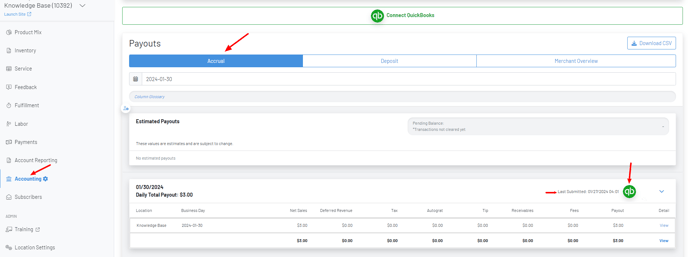 Navigate to the Accrual section of your Payouts page and click the QuickBooks icon on the information card for the business day in reference. If something is unlinked, it will tell you what and provide you an opportunity to link to a QBO GL Code and then try the export again by clicking the QBO icon.