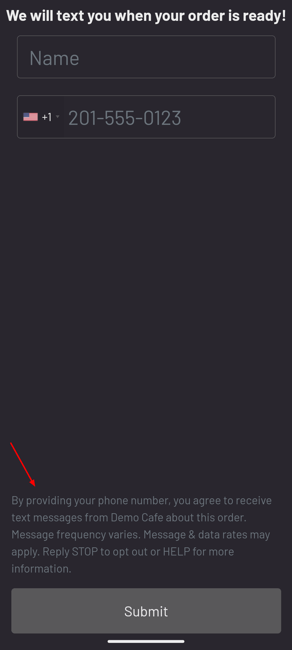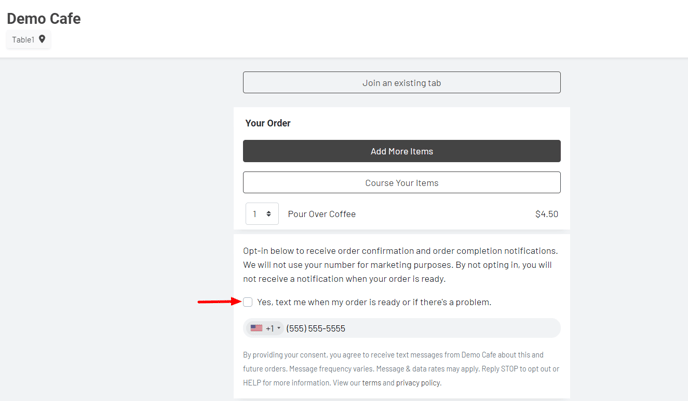 -For QR ordering, guests opt-in at checkout by clicking this checkbox above their phone numbers. This messaging is customizable and we’ll cover how to adjust that later in the article.