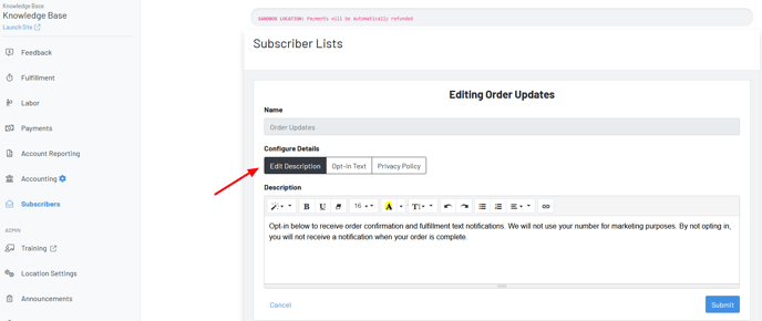 -Add a description. This description shows above the checkbox more thoroughly describing what a guest is opting into. We’re recommending to add that this is not a marketing list and it’s purely for notification when an order status updates.