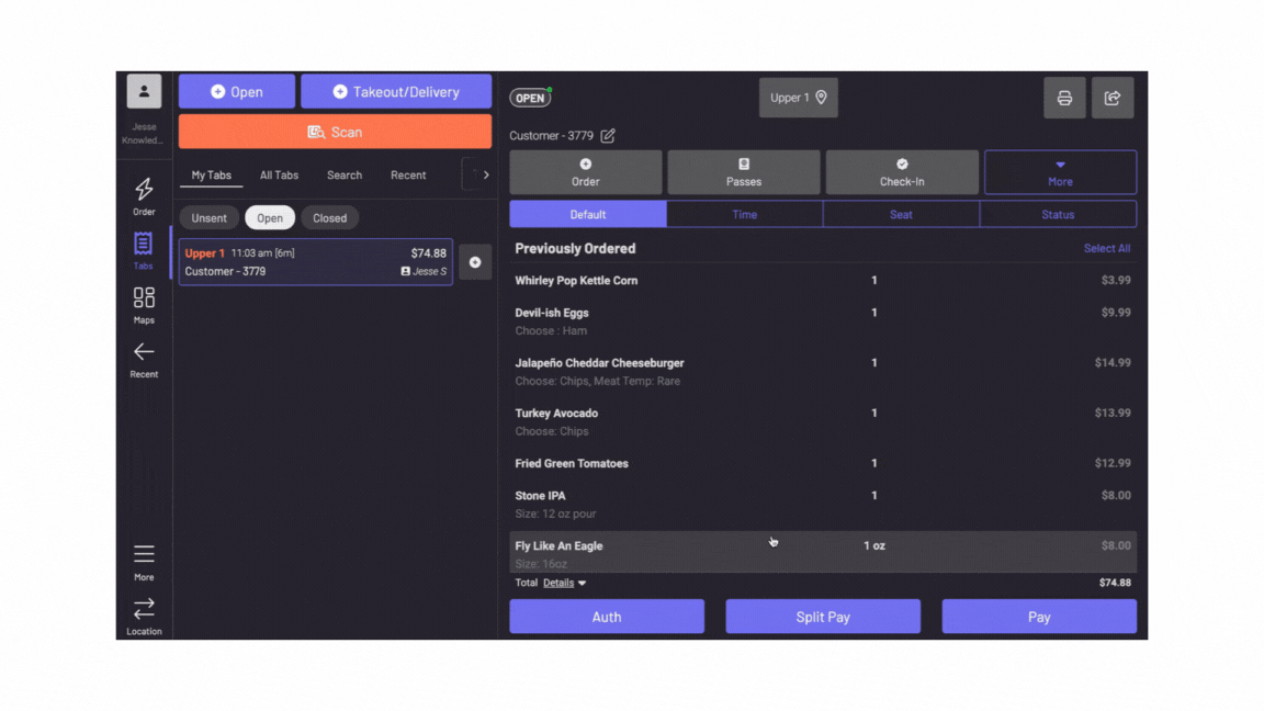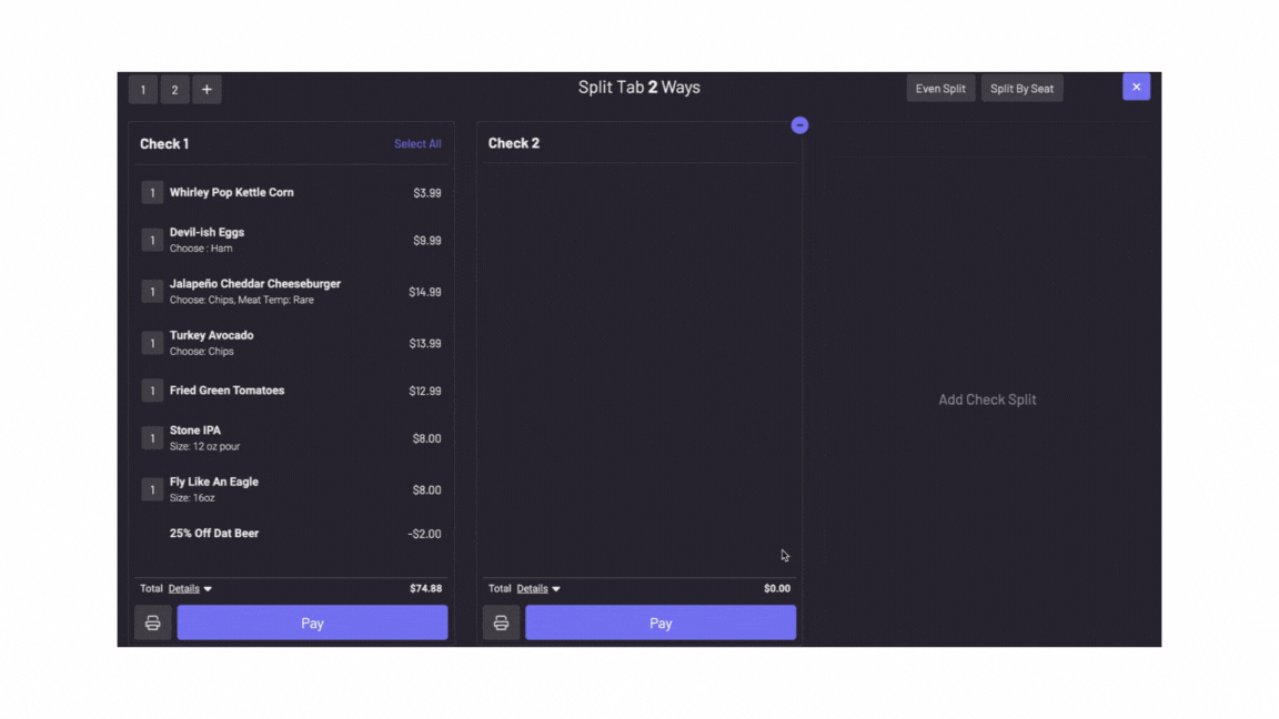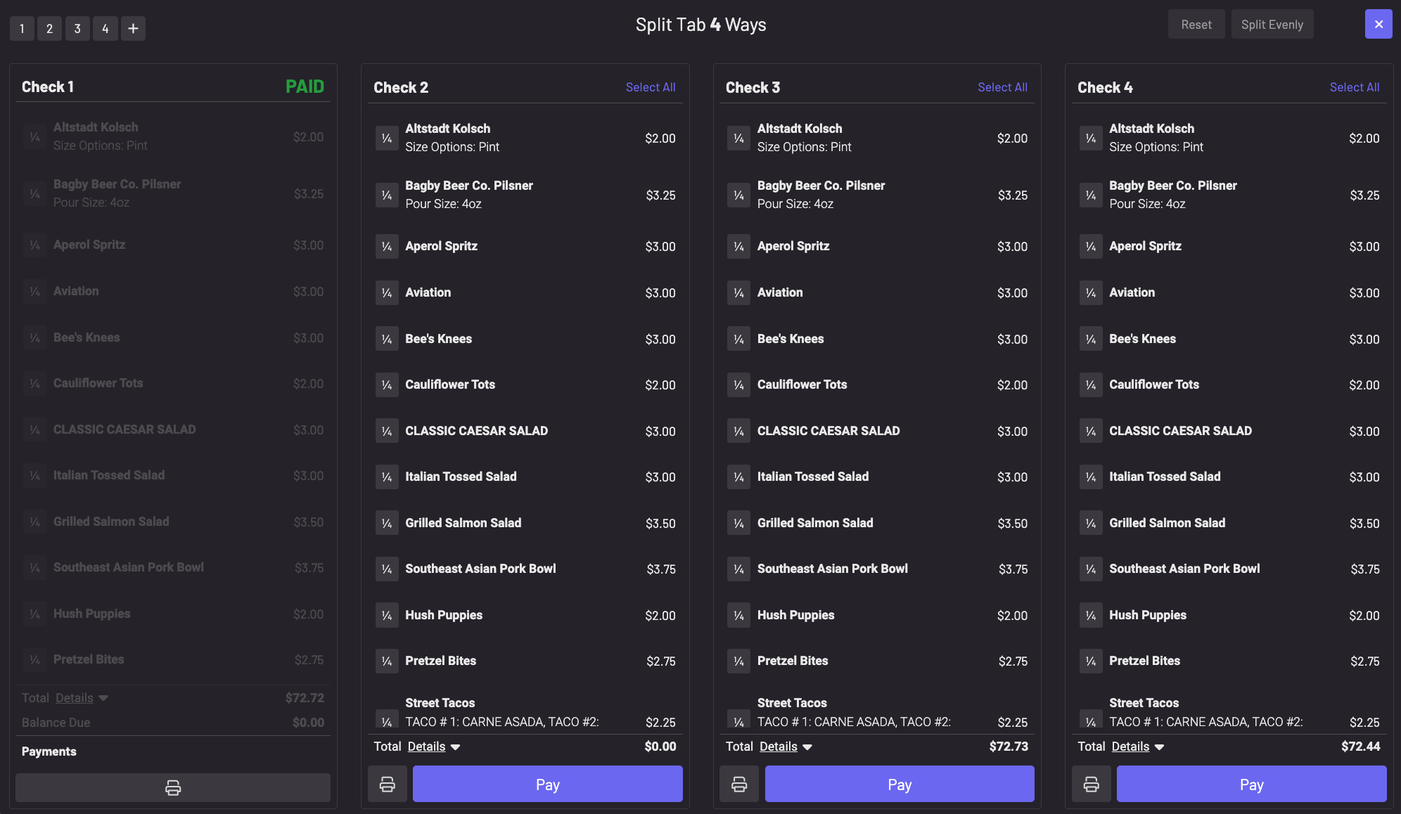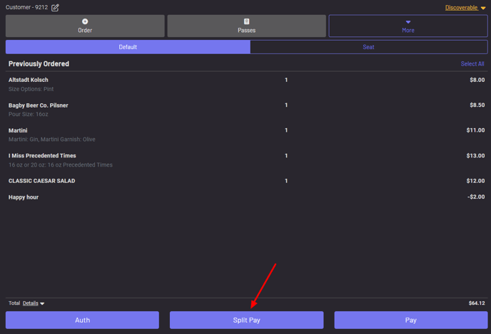 To use Split Pay, press “Split Pay” at the bottom of the tab.