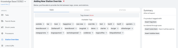 To understand how a Station Override is set up, a product that is tagged with Tag and ordered through Zone will be directed to Station.