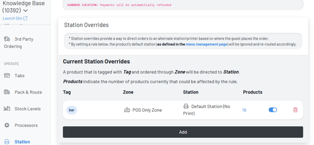 Station overrides are often used on complex setups such as operations with multiple bars, prep stations, and kitchens. Station Overrides allow your large operation to accommodate different zones, products, and stations.
