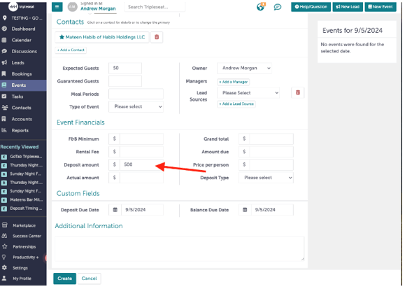 Step 1: Create Deposit In TripleSeat