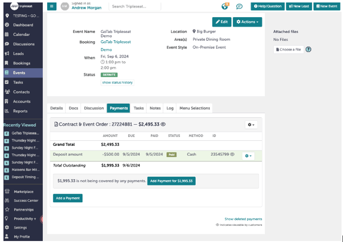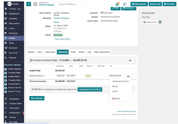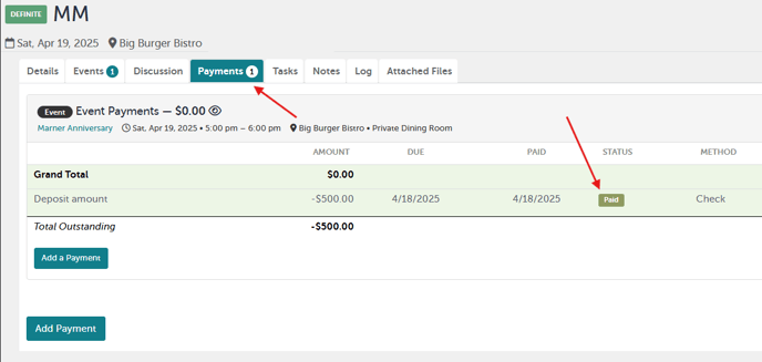 Once the event organizer has submitted credit card payment through TripleSeat, the deposit will be marked as “paid”