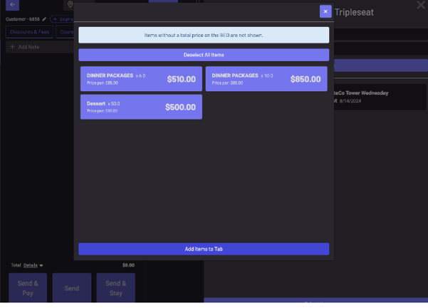 - A new window will appear with all items listed on the TripleSeat BEO. To add these to your tab, simply click “Select All Items”.