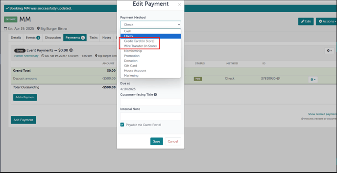 - One of the two “in-store” payment methods are selected. We cannot pull deposits in paid to these methods so please choose one of the other payment methods listed.