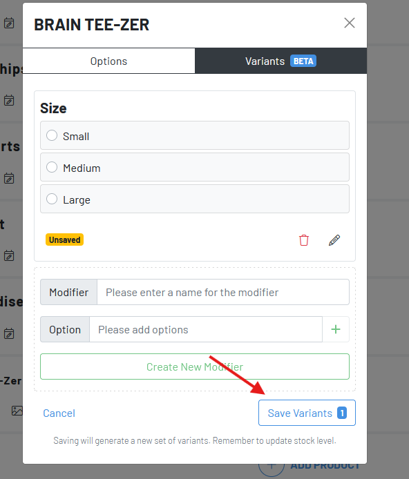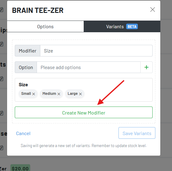 Enter your variant modifier name, which here would be size. Then add the size options, which here are small, medium and large
