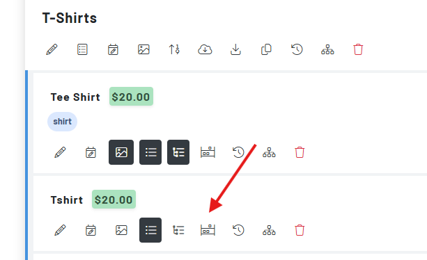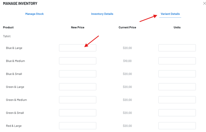 Once we’ve saved our variants, then we click the Control Stock Levels icon to adjust the pricing for each variant.