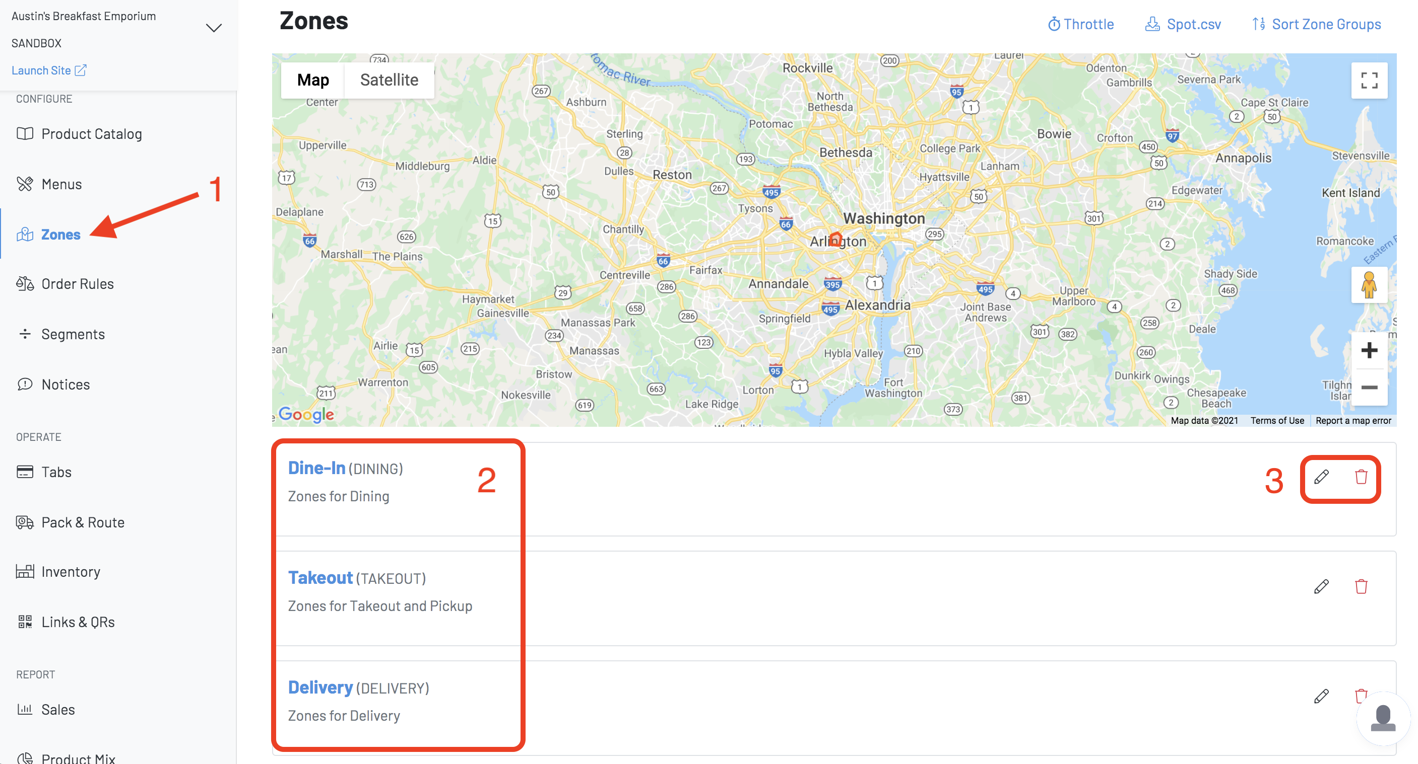 (2) These are your Zone Groups. They are simply containers for each Zone type and can be renamed for the guest facing side for example: “Curbside” vs “Takeout”. Any name changes to Zone Groups are strictly cosmetic.