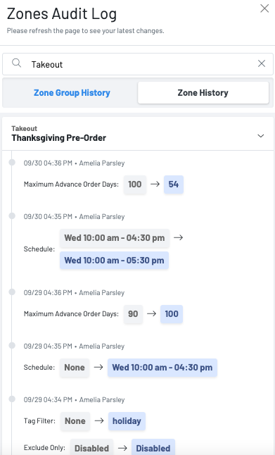 **Zone Audit Log: **The zone audit log allows you to see activity within your zone. You are able to see an audit log of any changes made from the zone group as well as the individual zone history.