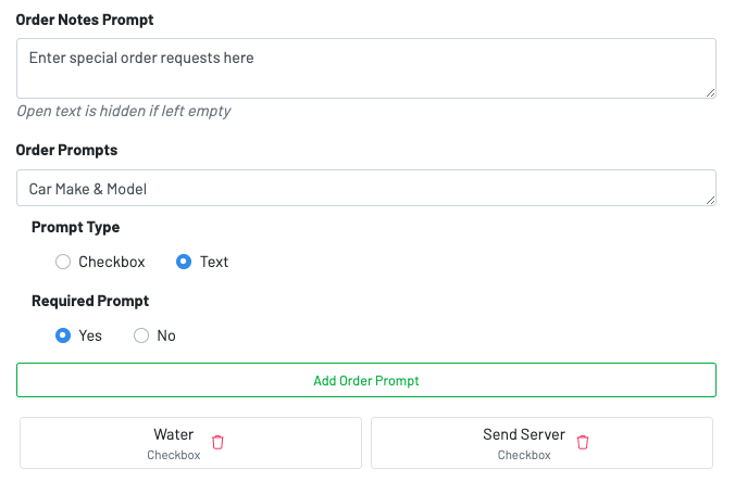 Section titled “Prompt Configuration”Order Notes Prompt: Enter a descriptor for the prompt